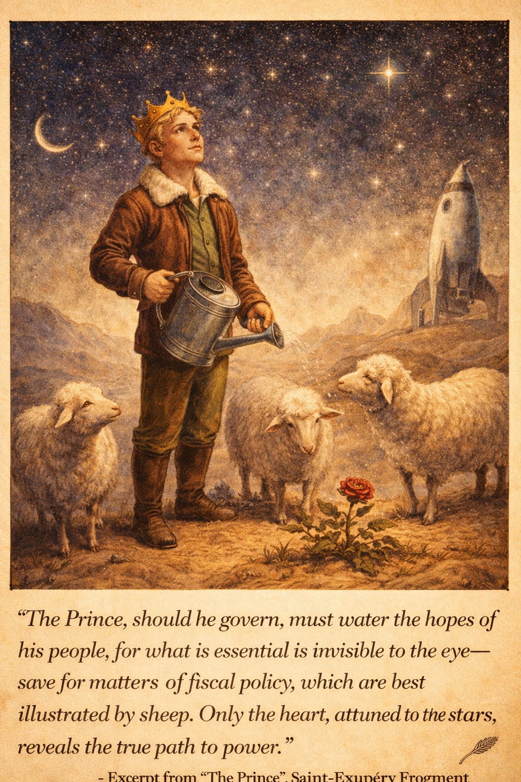 “The Prince, should he govern, must water the hopes of his people, for what is essential is invisible to the eye - save for matters of fiscal policy, which are best illustrated by sheep. Only the heart, attuned to the stars, reveals the true path to power.”