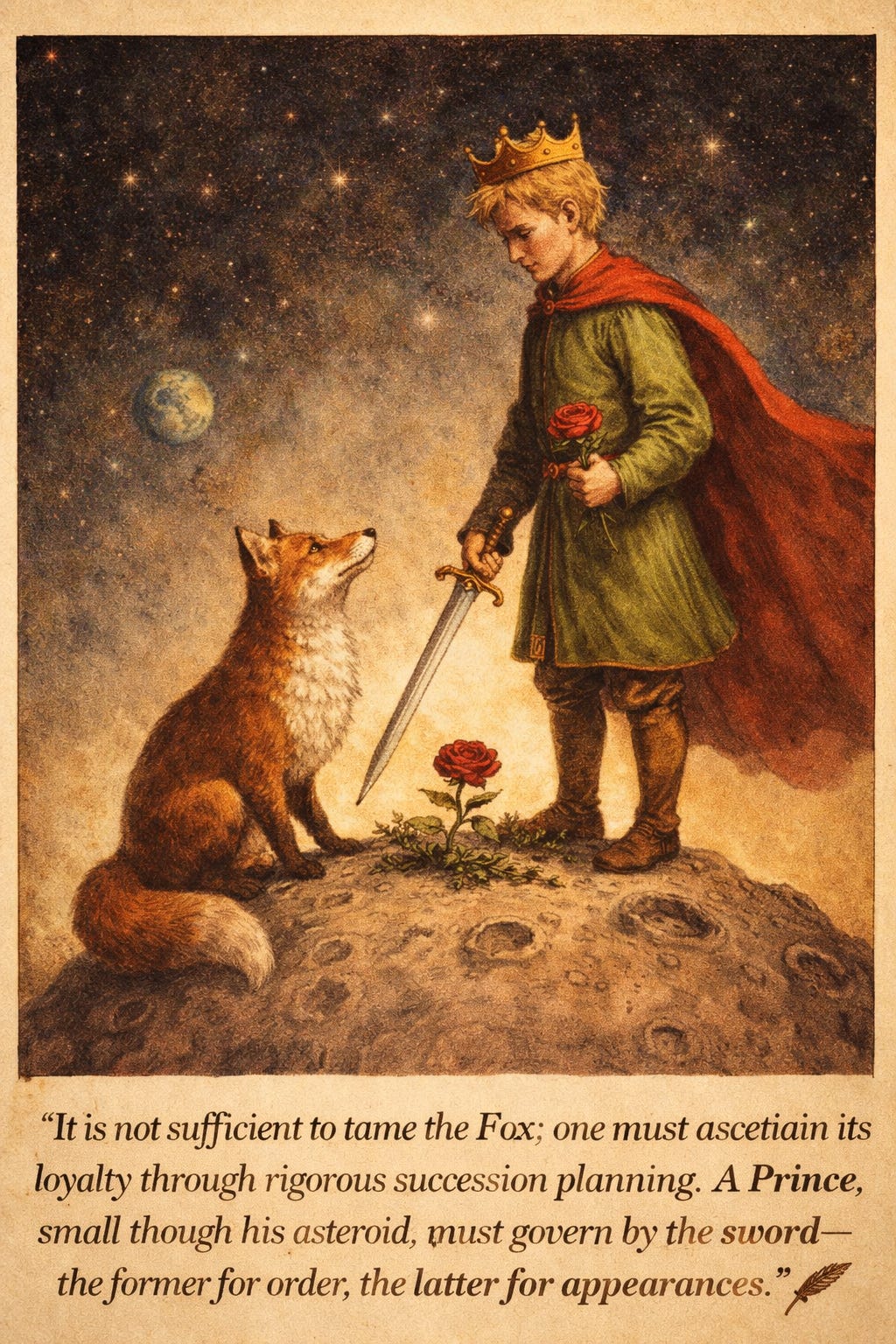 “It is not sufficient to tame the Fox; one must ascertain its loyalty through rigorous succession planning. A Prince, small though his asteroid, must govern by the sword and the rose - the former for order, the latter for appearances.”